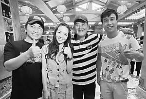 趙本山(右二)帶著小沈陽(右一)與到訪的吳宗憲(左一)、侯佩岑合影。