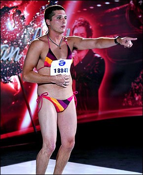 《美國偶像》從來不乏惡搞歌手,去年出了個比基尼女孩,今年又出了個比基尼猛男。周二晚,在節目進行過程中,參賽選手泰·海默靈(Ty Hemmerling)身著比基尼泳衣登臺獻唱,驚得眾評委目瞪口呆。