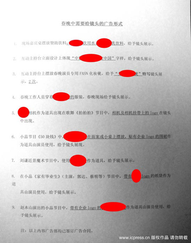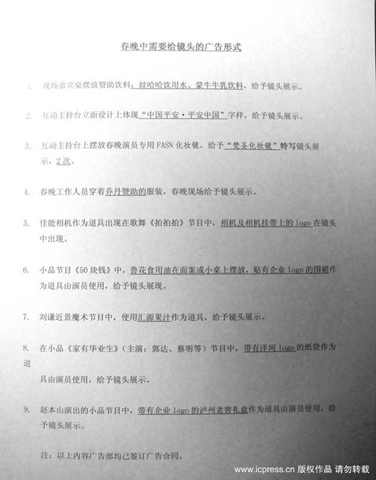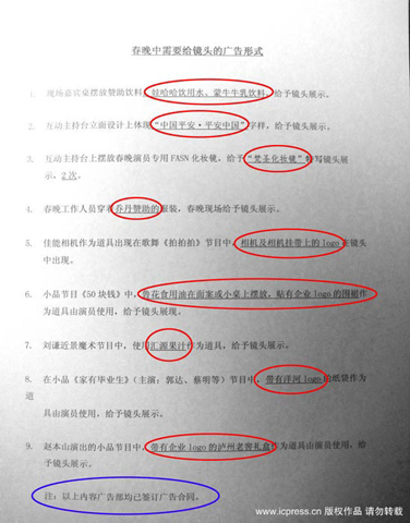 新民網(wǎng)3月2日報道 2010年3月1日,北京,央視虎年春晚廣告植入清單曝光,列出內(nèi)容次數(shù)、注明已簽合同,春晚當天需要給鏡頭的廣告形式都一一羅列,包括飲用水、化妝鏡、服飾、相機、酒等名目繁多。