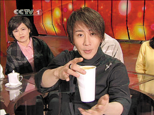 1.劉謙的魔術臺邊,赫然立著一桶某品牌的果汁。