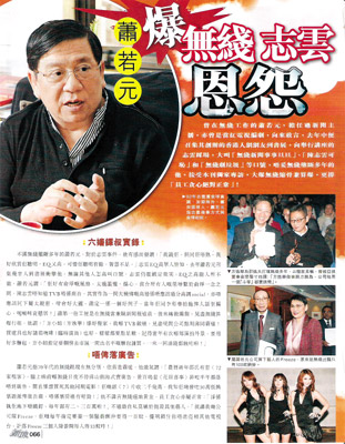 多年來,蕭若元一直不滿無線的壟斷行為。對于陳志云涉貪事件,他有感而發(fā):“我認識他多年,但和他不熟。我很欣賞他的聰明,EQ又高,可惜他聰明有余,智慧不足!标愔驹艵Q高眾人皆知,去年蕭若元召集了20多人在書展上攻擊他,無論別人怎么高喊口號,陳志云仍能鎮(zhèn)定微笑。但蕭若元指出:“陳志云太過濫權、偏心,作為一個大機構的高層,他不應該過分高調(diào),也不該和下屬太過親密,那樣會很麻煩。蕭定一就是一個例子,他當年和李彩樺拍拖,就被人指偏心。”