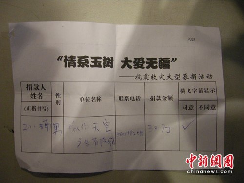 中新網(wǎng)4約0日電 今晚(4月20日)8時(shí),《情系玉樹(shù),大愛(ài)無(wú)疆——抗震救災(zāi)大型募捐活動(dòng)特別節(jié)目》將在中央電視臺(tái)1號(hào)演播大廳舉行。過(guò)百演藝明星參與,在今天下午的排練現(xiàn)場(chǎng),孫楠成為最早一批到達(dá)現(xiàn)場(chǎng)的歌手,并在第一時(shí)間捐出30萬(wàn)現(xiàn)金,向?yàn)?zāi)區(qū)人民做出一份善舉。