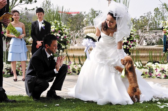 王學兵和孫寧別有新意地用他們的愛犬充當傳遞愛的使者,由愛犬將結婚戒指帶到現場。交換結婚戒指后,王學兵與孫寧舉起香檳向親友祝酒。