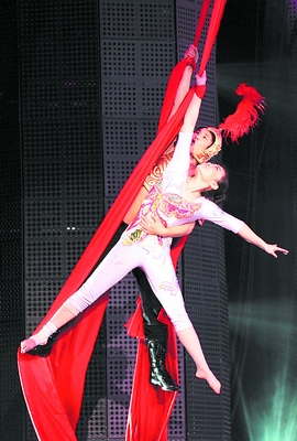 而整個節目的高潮,是在小沈陽換上露臍的盔甲裝,演唱電影《神話》主題曲。除了賣力演唱,他還在舞臺上玩了次“武俠”,手抓紅綢緞,抱著女演員在工體館上空飛來飛去,引得全場尖叫。