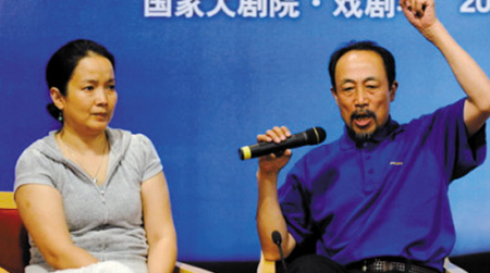 最激動的是飾演主角“培爾”的孫海英,打扮隨意的他剛拿起話筒時語調十分平靜,還被一旁的老伴呂麗萍調侃“說話像領導”。但談到演《培爾·金特》的感受,他的語調頓時激動起來,更大嘆“話劇已死”:“現在的戲劇都是在作假,互相說假話。人們都太浮躁,明明看不懂我們這部戲,只是看個熱鬧,到半場就回家了,還愣說看得懂———你明白個屁呀!什么都不明白!藝術不是因為你懂才來的,是因為不懂才來的,看不懂你就得學!我們不需要迎合大眾,你愛來不來。”