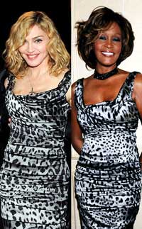 目前正在全球展開巡回演唱會的麥當娜,日前穿上一襲Dolce & Gabbana灰色豹紋小洋裝赴宴慶功,竟與惠特妮休斯頓在新專輯發表會上穿的洋裝是同一款式,兩大老牌歌后選在同日撞衫,相互較勁的意味濃厚。