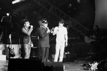 而師父趙本山和師弟小沈陽的陸續登臺獻唱,更是掀起高潮。小沈陽狂飆高音現場演唱了《三槍拍案驚奇》的主題曲《我只是個傳說》,隨后師兄弟倆合唱了一首《我的好兄弟》。之后師父趙本山的登臺讓全場觀眾報以雷鳴般的掌聲。趙本山身著黑色休閑裝酷勁十足,現場用調侃的方式介紹了所有樂隊成員,逗的臺下觀眾前仰后翻。