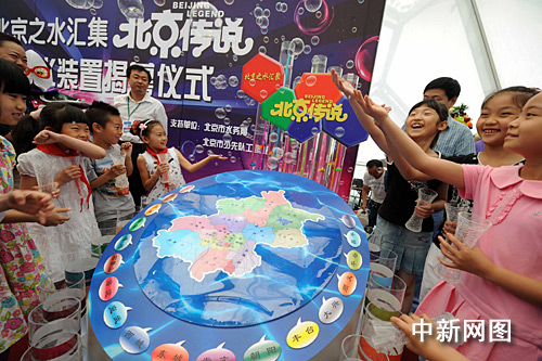 “北京之水匯集北京傳說”活動是圍繞北京兒藝六一大戲《北京傳說》中的節水環保主題而開展的、面向北京所有小學生及學齡前兒童的大型環保節水公益行動。現場12位節水小明星代表一起把他們從北京各水系取來的水標本匯集到“北京之水”大型環保容水裝置中,這一裝置高1.5米,它以藍色水波紋狀物體為底座,上方圓弧狀轉盤中用顯著顏色標識出北京水系分布情況,5月28日至6月1日《北京傳說》演出期間,該容器將放置在水立方場內,成為一道環保新景觀。