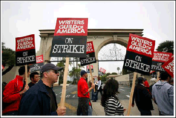 說起來讓人難以置信,罷工的起因是由于稿酬和版稅,而焦點卻在區區四美分。根據報道,編劇們要求在原先售出每張碟片可獲四美分版稅的基礎上,再加四美分。但這個小小的要求居然被“電影暨電視制作人聯盟”否決了。當然編劇們還有一些其他的要求。最后談判破裂,導致罷工開始,劇作家們走上街頭。