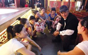 趙本山在二樓一直觀察排練,表情嚴肅。下樓后徑直走到臺前,把8位女孩叫到身邊!岸啻罅耍俊北旧酱笫鍛B度和藹,先和她們嘮起了家常。