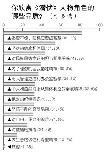觀眾欣賞《潛伏》中人物的哪些品質(zhì)?調(diào)查中81.6%的人首推“處變不驚、隨機(jī)應(yīng)變的智慧”,54.2%的人選擇“堅(jiān)定的信念和信仰”,43.6%的人選擇了“對(duì)民族國家命運(yùn)的擔(dān)當(dāng)和責(zé)任感”,接下來依次為:“為了理想的自我犧牲精神”(38.8%),“用人管理之道和辦公室哲學(xué)”(36.3%),“個(gè)人利益絕對(duì)服從集體利益的奉獻(xiàn)精神”(32.9%),“絕對(duì)的紀(jì)律意識(shí)”(32.0%),“坐懷不亂的高尚品德”(31.4%),“對(duì)自由、正義的追求”(31.0%),“對(duì)愛情的執(zhí)著”(24.9%),“做生意的誠信和專業(yè)精神”(13.7%)。