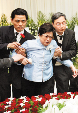 孫道臨的靈柩停放在靈堂中間,紅色玫瑰包圍中的他身披黨旗,面容安詳。靈柩正前方擺放著五個小花圈,來自孫道臨的近親屬,中間孫夫人王文娟送的花圈用紅玫瑰擺放成心型,夫妻情深可見一斑。靈堂兩邊也擺放著白玫瑰做成的花圈,其中有來自江澤民、溫家寶等領導人的,有來自秦怡、張瑞芳等老藝術家的,也有來自上影集團等單位團體的,所有人都用自己的方式向孫道臨的逝世表示了最沉痛的哀悼。