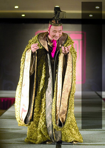 陳佩斯身穿金黃色龍袍在T臺(tái)上大作秀,“阿斗”的服裝是雙面設(shè)計(jì),被陳佩斯稱為節(jié)約的龍袍。