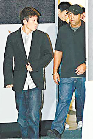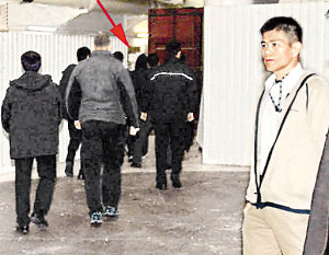 陳冠希(箭頭所指)進(jìn)出香港警署都有眾多私人保鏢前后簇?fù)怼?br/>