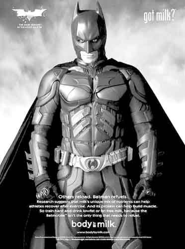 這次廣告的宣傳語是:“大家刻苦訓練,然后喝低脂或脫脂牛奶吧。因為不是只有蝙蝠俠車需要加油!痹搹V告將于6月1日正式推出,而最新的蝙蝠俠系列電影則在7月18日上映。