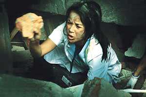 劇照中,蔣雯麗蹲在一片廢墟之中,身上、臉上全是泥,她用雙手在鋼筋瓦礫的廢墟中扒找自己的同事和醫藥箱。拍攝現場,混凝土塊還懸在半空中,搖搖欲墜。