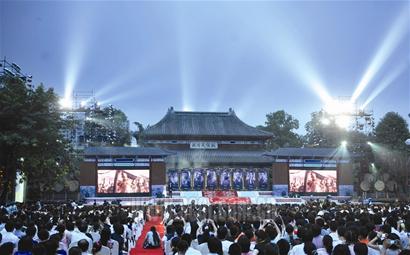 夜幕降臨,典禮正式開始,薦馨殿前3米多高、20多米長的3層舞臺氣勢非凡,舞臺上10個醒目的大鼓和飄揚的戰(zhàn)旗呈現(xiàn)出三國時代金戈鐵馬的風貌。觀眾的耳畔響起震天的喊殺聲和咚咚戰(zhàn)鼓,數(shù)十名披著盔甲的蜀國士兵揮舞紅旗沖上臺擺好軍陣,這時近百名兒童念著蘇軾的《赤壁懷古》從舞臺上緩緩走下。之后,本土川劇演員還表演起變臉吐火,他們的臉譜盡是三國猛將,臺下的吳宇森導演看得如癡如醉。值得一提的是,舞臺兩個大屏幕播放了10分鐘的《赤壁》片花,其中很多都是當天成都上映沒有呈現(xiàn)的部分,讓影迷看了大感過癮。
