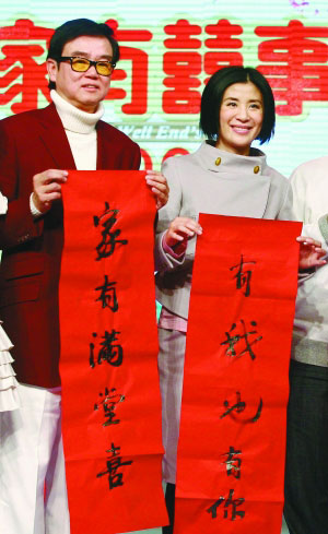 香港喜劇經(jīng)典《家有喜事》系列時(shí)隔11年后推出的《家有喜事2009》定于明年1月28日大年初三上映。影片主演黃百鳴、吳君如、姚晨、郭濤以及導(dǎo)演谷德昭等出席了昨日的發(fā)布會(huì)。該片是吳君如生子后接演的首部電影,不過她表示已有意減產(chǎn),多留時(shí)間給家人。盡管老公陳可辛已提出想與自己合作新片,但是吳君如透露因?yàn)樽约翰粫?huì)減片酬,所以還是希望老公多去賺外快。