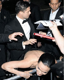 影迷們見到兩位明星瘋狂吶喊,蜂擁而上期望與偶像近距離接觸,結果茱莉被人流擠得動彈不得,緊抓欄桿向老公求救,卻依然面帶笑容保持風度。皮特把影迷們丟到了一旁,趕忙過去搶救茱莉。記者張碩