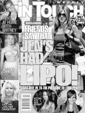 該雜志先前認(rèn)為安妮斯頓在臉部、嘴唇、胸部和鼻子都做過手腳,而這些猜想最后由安妮斯頓的朋友加以證實(shí)。據(jù)該朋友介紹,安妮斯頓因?yàn)閾?dān)心自己被讀者看出年華老去,因此在身上作了不少微整形,最后效果引得讀者大贊的同時(shí),也讓她第二天參加新片首映會(huì)時(shí)吸引更多媒體上門采訪。