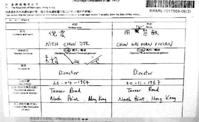 倪震發(fā)表結(jié)婚聲明之事震驚娛樂圈,19日,有記者在金鐘婚姻登記處發(fā)現(xiàn),12月18日(倪震宣布婚訊當(dāng)日)的“婚姻監(jiān)禮人”項(xiàng)目上,有一封填有倪震及周慧敏姓名的擬結(jié)婚通知書,兩人出生日期分別是26-04-1964及20-11-1967,職業(yè)一欄同時(shí)寫著“Director”(主管),住址則填報(bào)位于北角的寓所。