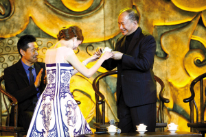 由于影片中出現(xiàn)眾多“雷人”的臺詞,外界對于《赤壁(下)》的期待,已經(jīng)從一部歷史片演變成一部賀歲喜劇片。不知道是不是受此影響,前晚剛在北京看過《赤壁(下)》的主創(chuàng)們,在昨日的首映發(fā)布會上也都充滿了“喜劇感”。穿一襲青花修身裙子亮相的林志玲特意在現(xiàn)場大秀茶藝,為各位赤壁將領(lǐng)沏上功夫茶,并親手送到導(dǎo)演與諸位男演員手里,讓一眾男士感覺十分受用。而成龍大哥也前來捧場,一上臺便給好友吳宇森一個熊抱,整個場面其樂融融。