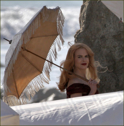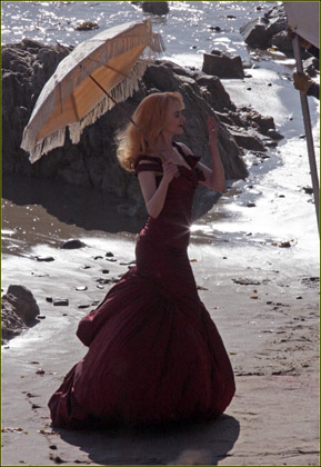 妮可·基德曼2月19日在洛杉磯的某海灘上為某雜志拍攝宣傳寫真,當天的妮可·基德曼化身中世紀的貴婦,穿著暗紅色的絕美長裙,襯得身材玲瓏,肌膚透白,手中的陽傘更是增添了高貴優雅,和妮可·基德曼得天獨厚的氣質完全符合。