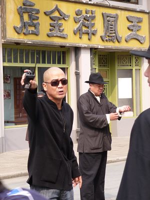 根據劇組的通告,昨日《建國大業》劇組從早晨6點30分就開工拍攝。當早報記者于中午時分趕到車墩時,導演黃建新正在“拍兩個不知名人士的戲份”,不見“蔣介石”的扮演者張國立,但劇組人員保證“張國立今天來了片場”。下午2點,劇組午休時間結束。“南京路”上忽然多出了一群黑衣黑帽、幫派打扮的群眾演員。同時,一輛車輪外側被涂成金色的“另類”黃包車也出現在“南京路”的一頭。幾分鐘后,現場忽然一陣騷動,許多原本在附近休息的游客都涌向了“南京路”口,拿出相機拍個不停。原來是“杜月笙”馮小剛出現了。同時,還有一個光頭、戴著墨鏡、手執大喇叭的男子,在給馮小剛以及現場的群眾演員安排走位。仔細一看,這位“現場導演”不是別人,正是“蔣介石”張國立。原來整個上午,張國立并沒有休息,而是呆在劇組在片場臨時設置的工作室內,和另一位導演韓三平一起,看之前拍攝的回放。