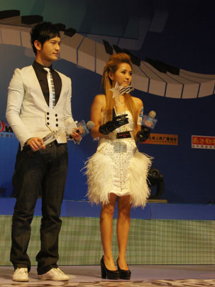 中新網3月14日電 日前,香港,眾星出席"9+2音樂先鋒頒獎禮2007"大典。發行新專輯《明明不是angel》的何潔再度耀目香江,三次登臺,獲得年度最佳女歌手和先鋒跳舞女歌手兩項重量級大獎,她激動不已,表情十分夸張 。