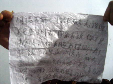對于寵物蛇的意外出現現場有著種種猜測,但據四川新聞網記者通過特殊渠道獨家拿到的一張半截紙片顯示,歌迷放蛇的主要目的是抗議何潔公開宣稱自己不想當亞洲人。這張被現場工作人員搶走半截的紙片由鉛筆寫成,內容主要為“何潔不好!你個賤人說自己不是亞洲人,你咋不說你不是中國人?你丟臉丟到國外去了……”這封顯然是草草寫就的抗議信尾更明確寫到,今后將不只會丟蛇,更會繼續送上老鼠和昆蟲。