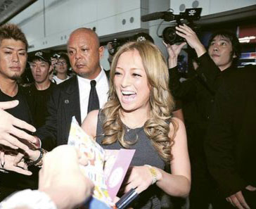 據香港《明報》報道,昨午2時,身穿灰色貼身裙的濱崎步在10多名日籍工作人員護送下步出機場,現場有逾百名粉絲迎接,主辦單位亦聘請50名保安筑起人墻。原本安排濱崎步經VIP通道往上落客區乘車,但親民的她見到粉絲守候多時,面露燦爛笑容之余,更主動上前打招呼及握手。經過一輪近距離接觸后,濱崎步一度收起笑容,似有心事,然后登車離開。