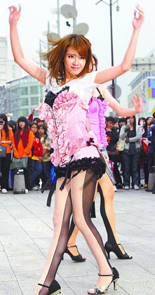 中新網(wǎng)3月28日電 蔡依林(Jolin)昨日(27日)在西門町封街拍新歌《花蝴蝶》舞蹈教學(xué)示范帶。Jolin身穿粉紅馬甲、黑色蕾絲邊粉紅小熱褲,腳上已舍棄美美高跟鞋,改以專業(yè)的國(guó)標(biāo)舞鞋上陣,只為了避免腳踝舊疾復(fù)發(fā)。