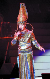 作為一個(gè)擁有自己時(shí)裝品牌的設(shè)計(jì)師,維塔斯的每次亮相都給人以華麗之感。昨晚,他更是頻繁換裝,從太空人造型到金燦燦的宮廷服裝以及鑲滿亮鉆的禮服,充分展現(xiàn)其王子形象。不過他每次唱完一兩首歌就要下臺換裝,空留樂隊(duì)在臺上演奏,樂隊(duì)一曲奏畢,他仍然沒有現(xiàn)身,幾度出現(xiàn)空場的情況。起先場下觀眾會(huì)禮節(jié)性地報(bào)以掌聲,但兩三次之后,有些觀眾便不耐煩地吹起口哨。好在每一次維塔斯重返舞臺,都能迅速抓回觀眾。