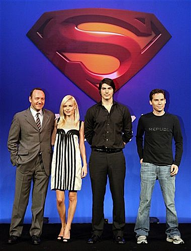 8月1日,電影“超人歸來”在日本東京做宣傳。圖為劇中演員凱文·斯帕西(左一)、 凱特·伯斯沃斯(左二)、布蘭登·羅斯(右二),以及導演布萊恩·辛格(右一)。(法新社圖)