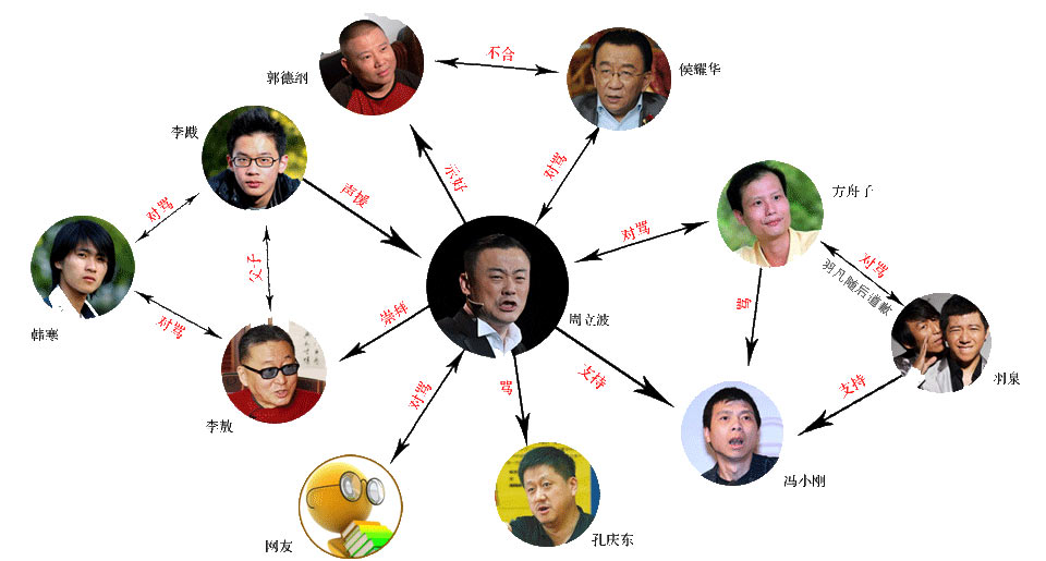 原本大家關注周立波是因為他的清口、他的八卦,現在關注周立波緣于他和網民們的一場口舌之戰。“若將網絡民意當真,實是一種‘自宮’行為”,周立波在微博上發聲后,隨即又提出“網絡公廁論”。在引起眾多網友的不滿后,“打假斗士”方舟子、孔慶東和葉匡正也被卷入其中。…… [詳細]