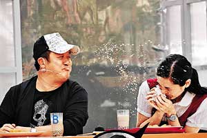中新網(wǎng)10月22日電 據(jù)《新明日報》報道,香港無線電視最近在臺灣為《味分高下》終極篇錄影,昨日在臺北小巨蛋門前拍攝。《獎門人》主持人曾志偉絲毫不懂憐香惜玉,喝珍珠奶茶時,居然將牛奶茶噴得郭羨妮滿頭都是。郭羨只能強(qiáng)顏歡笑,十分狼狽。