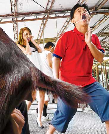 中新網10月25日電 臺灣媒體報道,吳宗憲(右)跟女星Linda日前在臺灣南部牧場錄臺視《綜藝大勝戰》,被制作單位要求現場喝羊乳,看到熱騰騰的羊乳直接“射”過來,Linda嚇到花容失色,反而是吳宗憲自得其樂,不僅歪嘴接奶,還喝到溢奶。