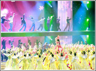 歌舞類節目時長為1小時,記者粗略計算,僅上半場的歌舞類節目就占了近50分鐘。開場舞《飛向春天》由185位女舞者共同完成,她們不斷變換隊形,時而如花潮涌動,時而像火山噴發,熱鬧而奢華;舞蹈《飛天》題材獨特,7位女孩宛若傳說中的七仙女,舞步婀娜多姿。歌曲方面,費玉清有幸獨唱《千里之外》,其他歌曲則多以串燒形式登臺,龐龍的《啷咯情歌》、鳳凰傳奇的《月亮之上》、黃圣依的《天天向上》、胡楊林的《香水醉》、張瀾瀾的《一家人》、郭美美的《不怕不怕》分別占據流行板塊和新人板塊。