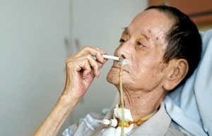 因?yàn)殚L(zhǎng)期抽煙,范老的肺不是很好。住院以后,由于長(zhǎng)期不活動(dòng),抵抗力下降,肺部受到感染。今年2月份,醫(yī)院為范老實(shí)施了氣管切開術(shù)。