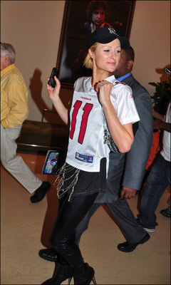 北京時間2月2日(北美時間2月1日),美國大型體育盛況超級碗在眾多明星的歌唱中緩緩的拉開了序幕,臺上明星璀璨,臺下更是星光熠熠,當天晚上(2月2日)記者就拍到了豪門名媛帕麗斯·希爾頓。當晚的帕麗斯·希爾頓身穿一身運動服裝,但是仍然難掩甜美性感,據悉當晚希爾頓就程飛機飛回了英國倫敦。