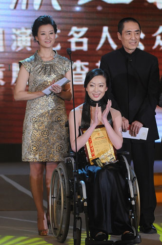 雖然執(zhí)導(dǎo)國慶60周年焰火晚會重任在肩,但是昨天張藝謀依然來到盛典現(xiàn)場,領(lǐng)取了“中國最杰出成就榮譽”和“中國公眾滿意度最佳演藝名人”榮譽,并擔(dān)任頒獎嘉賓。更為難得的是,獲得“中國年度舞蹈最佳表現(xiàn)女演員”提名的舞蹈演員劉巖也坐著輪椅出現(xiàn)在現(xiàn)場。這是手術(shù)之后的劉巖首次公開亮相公眾場合。劉巖原本是北京奧運會獨舞《絲路》的A角,但是由于車臺操作失誤,造成劉巖從近3米高空踩空、墜落,導(dǎo)致她嚴重受傷,并為此付出了無可挽回的代價……