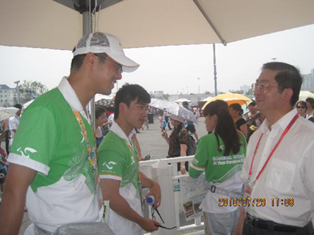 上午10時許,崔明華在世博園區(qū)志愿者部負(fù)責(zé)人的陪同下,看望了在中國館區(qū)域提供服務(wù)的華僑華人世博志愿者,并與他們親切交談。他仔細(xì)詢問了志愿者的工作狀況、身體情況以及為游客服務(wù)的事項,叮囑他們在高溫下要照顧好自己的身體,更好地服務(wù)于游客。