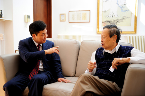 已是88歲高齡的楊振寧教授,見到友人朱奕龍一行來家拜訪,很高興,緊緊拉住朱奕龍的手,熱情地招呼朱奕龍坐在他的身邊,夫人翁帆沏上濃濃的茉莉花茶,大家暢敘友情。楊振寧教授還爽朗答應朱奕龍的邀請,明年春暖花開的季節,一定攜夫人到寧夏來走一走看一看。(舒展)