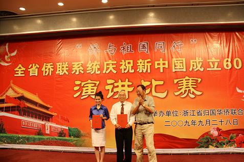 為慶祝新中國成立六十周年,浙江省僑聯(lián)于9月28日下午,在浙江圖書館二樓報(bào)告廳舉辦了以“僑與祖國同行”為主題的全省僑聯(lián)系統(tǒng)演講比賽活動,由各市僑聯(lián)推薦的、來自全省僑界各行各業(yè)的19名參賽選手參加了比賽活動。
