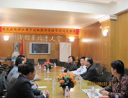 在法國期間,訪問團拜訪了法國華僑華人會。現任主席陳勝武及副主席張過祥、陳其躍等負責人,熱情接待了訪問團,相互進行了座談;訪問團還參觀了位于巴黎市中心四區的會所、文化中心,及中華文化學校。通過座談參觀,訪問團了解到,近年來,隨著中國國力迅速增長,旅法華人地位不斷提高,華人也在改變過去不關心政治的慣例,正在努力融入當地主流社會。訪問團與法國華僑華人會互贈了禮品;法國歐華歷史學會會長葉星球還向訪問團贈送了其撰寫的《法國華人三百年》一書。