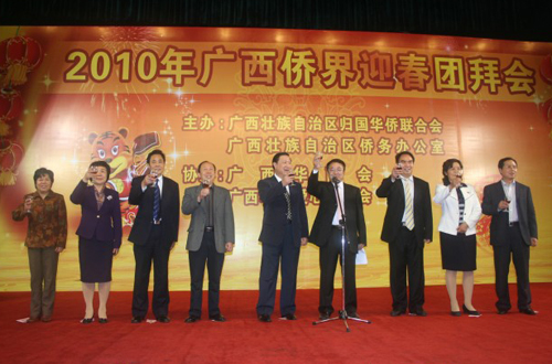 中新網2月20日電 據廣西僑聯消息,日前,2010年廣西僑界迎春團拜會在南寧市明園飯店隆重召開。本次團拜會由廣西自治區僑聯、自治區僑辦主辦,廣西華商會、廣西華僑愛心基金會協辦。