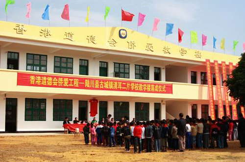 通過廣西自治區僑辦牽線搭橋,捐助支持廣西各項公益事業的僑社和慈善團體中,香港道德會較為突出。香港道德會是香港有名的慈善機構,2009年先后在廣西欽州市欽南區新營村、賀州市八步區東南村、岑溪市地麻村、陸川縣清耳村等地,捐建4所小學,捐贈總額達172萬元人民幣。這些受捐建的小學有個響亮的名字:“香港道德會僑愛教學樓”。