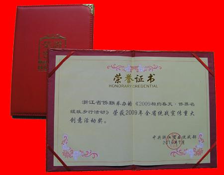 中新網(wǎng)3月1日電 據(jù)浙江僑聯(lián)網(wǎng)消息,辛勤耕耘終結(jié)碩果。年初捷報(bào)傳來(lái):浙江省僑聯(lián)舉辦的“2009相約春天•僑界名媛故鄉(xiāng)行活動(dòng)”榮獲2009年全省統(tǒng)戰(zhàn)宣傳重大創(chuàng)意活動(dòng)獎(jiǎng)。