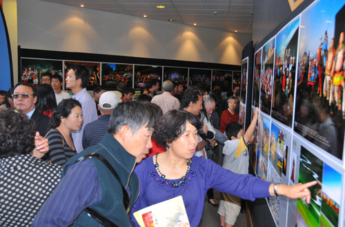 演出前,“文化中國•四海同春”大洋洲藝術團團長、國務院僑辦副主任趙陽在劇場外大廳為《中華民族全家福》圖片展剪彩。一幅幅圖片展示著中國56個民族多姿多彩的文化生活。基督城僑胞們或駐足欣賞,或興奮地向周邊朋友細說自己在中國的所見所聞。