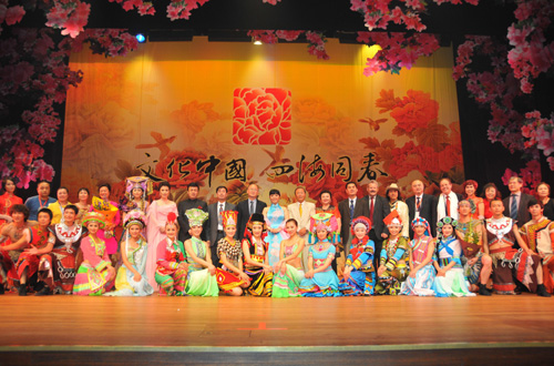 演出開始之前,在劇場外廳還展出了《中華民族全家福》圖片展,國僑辦副主任趙陽和張利民大使為圖片展揭幕剪彩。參展的百余幅照片制作精良、集中展示了中國56個民族的生活習俗、服裝服飾、文化特點、周邊地貌等,吸引了眾多觀眾駐足觀看。